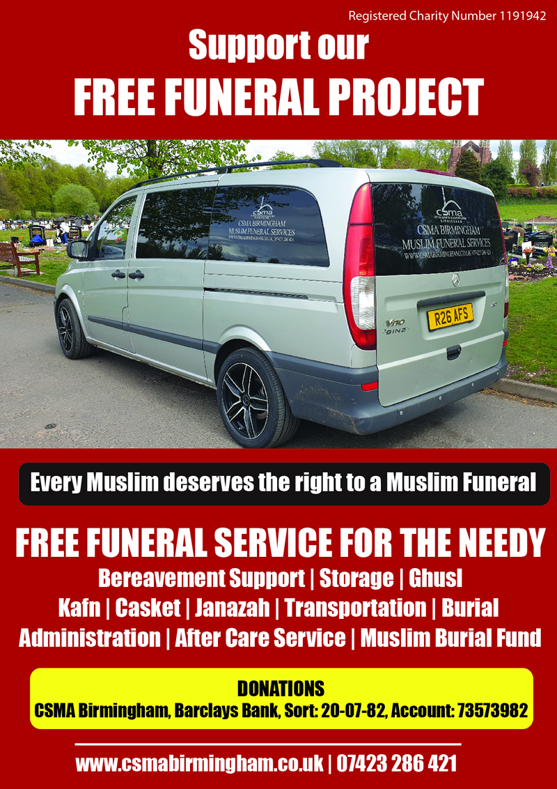CSMA Birmingham is a registered charity (1191942) based in Birmingham providing FREE FUNERAL PROJECT (Bereavement Support and Funeral Services) for the needy for the last 12 years.