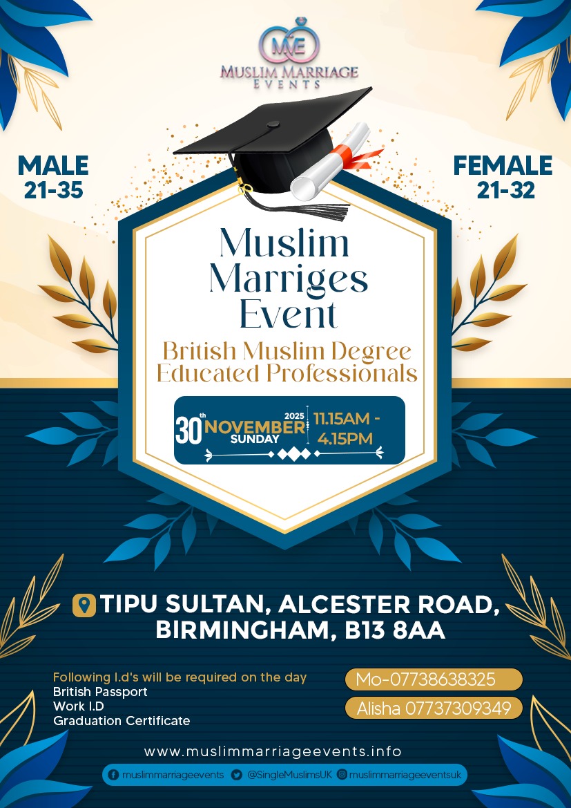 We are holding the next muslim marriage event on Sunday 30th November 2025 at Tipu Sultan, Alcester Road, Moseley, Birmingham, B13 8AA.