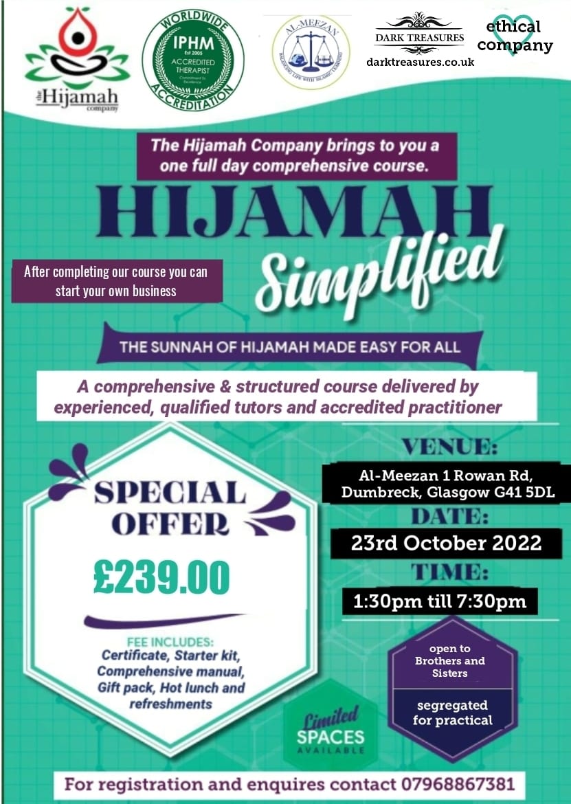 Learn Hijamah (wet cupping) in a fully comprehensive structured 1 day course, delivered by experienced, qualified and accredited Practitioner. Other topics covered: dry cupping, fire cupping & cupping massage.