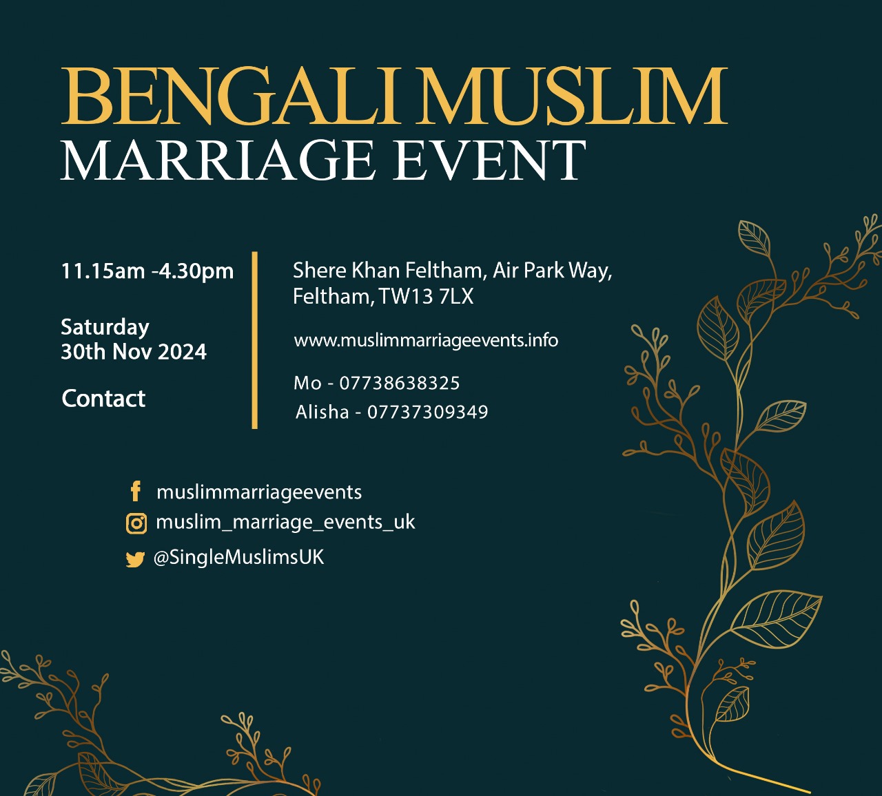 For more info please call Alisha on 07737309349 or Mo on 07738638325 or visit our website on https://muslimmarriageevents.info/event/bengali-muslim-marriage-events-london/