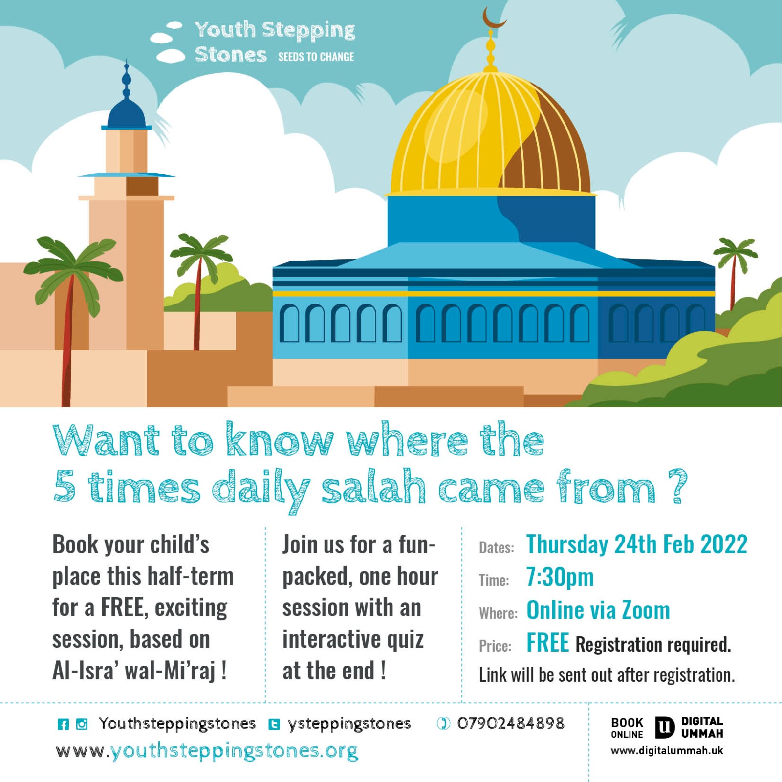 Book your child’s place now for this FREE event to join an interactive, informative session that will teach the story of the Night Journey and the Ascension of the Prophet (sallallahu alayhi wa sallam) along with how the command of Salah came to be. A quiz will be included!