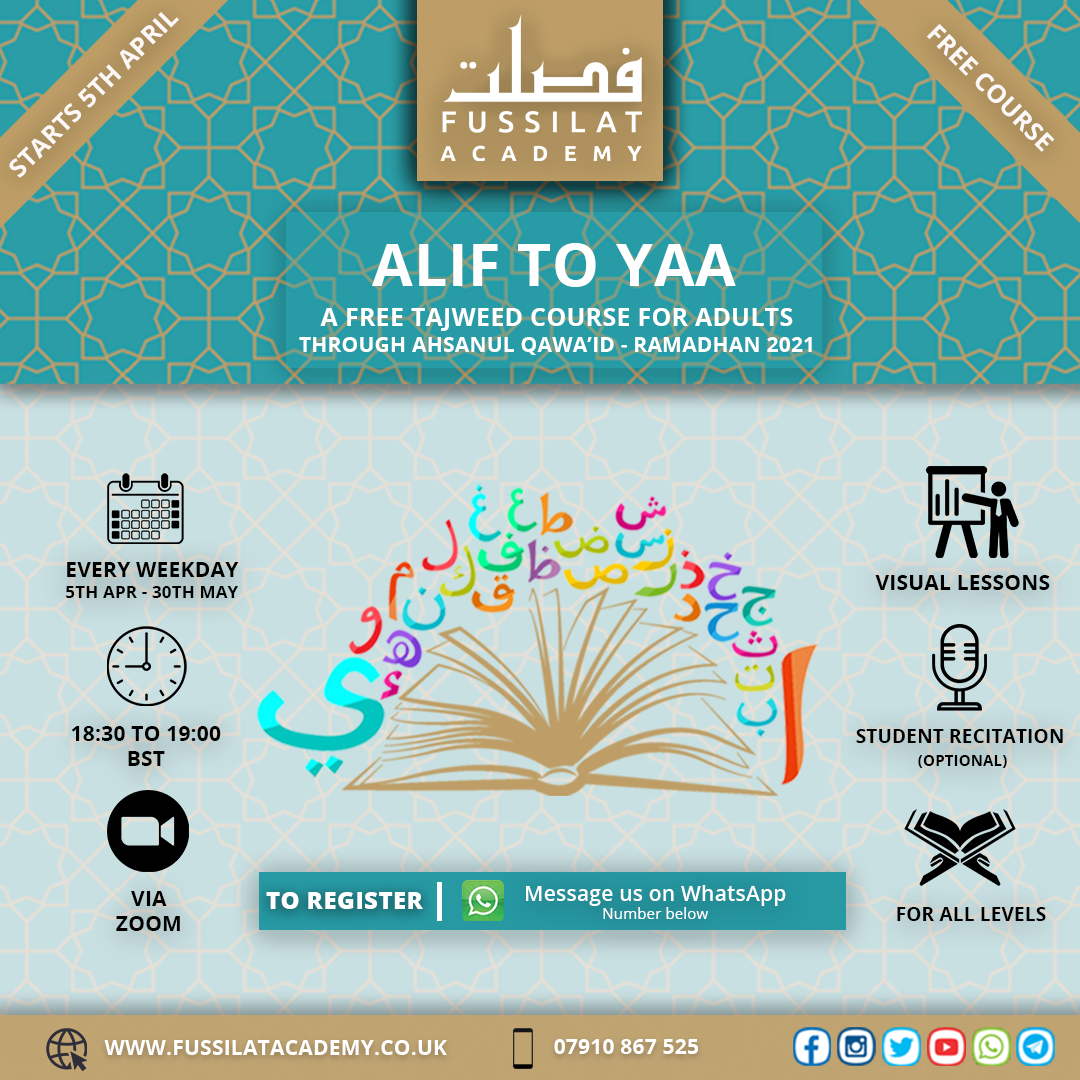 Fussilat Academy is proud to announce its new upcoming course this Ramadhan, the Alif to Yaa Tajweed Course.