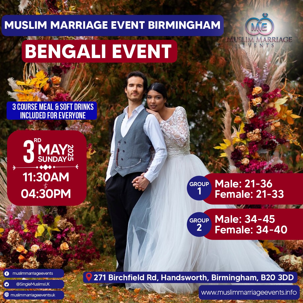 We are holding the next Birmingham Bengali Muslim Marriage Event on Sunday 3rd May 2025 at Royal Suite, 271 Birchfield Road, Perry Barr, Birminghan, B20 3DD.