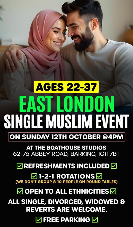 TICKET LINK: https://www.eventbrite.co.uk/e/east-london-single-muslim-marriage-events-for-ages-22-37-tickets-1688717813439