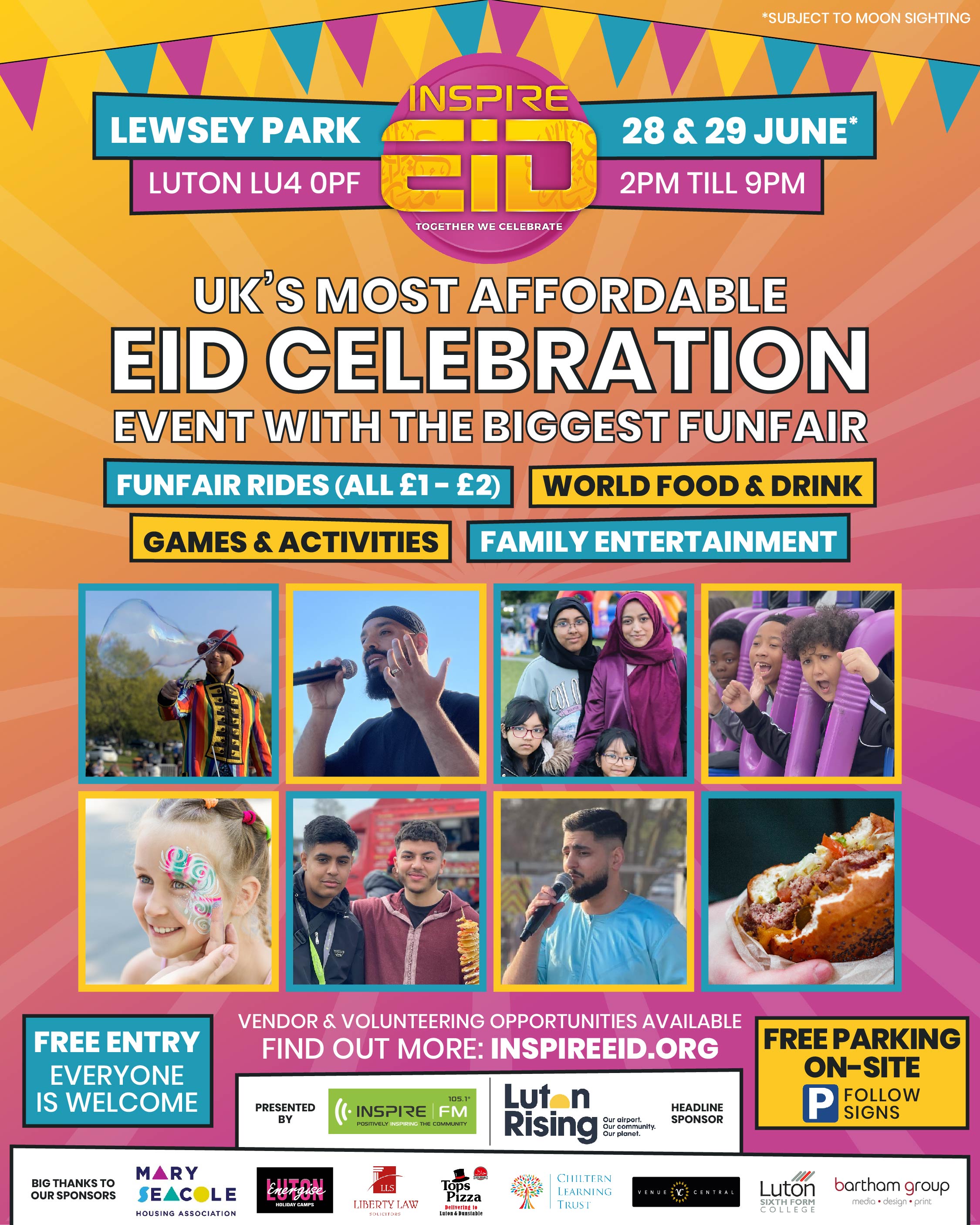 Inspire FM is thrilled to present the UK's most affordable community Eid Festival. The two-day festival takes place at Lewsey Park, Luton on 28th and 29th June (subject to Eid date confirmation).