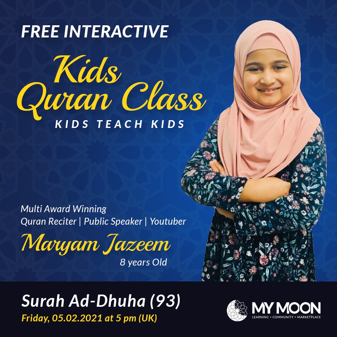 Your kids have the chance to learn with Maryam on Friday, 05.02.21 at 5 pm (UK) Surah Ad-Dhuha (93).
