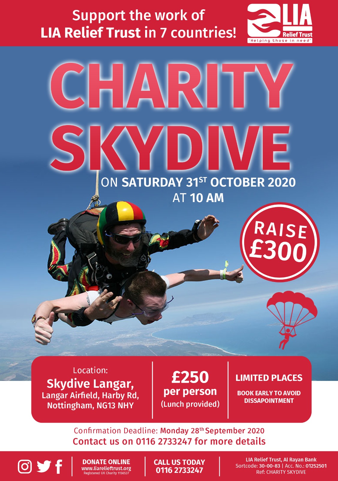 Join LIA Relief Trust for a charity skydive and raise £300 to support our work in 7 countries!