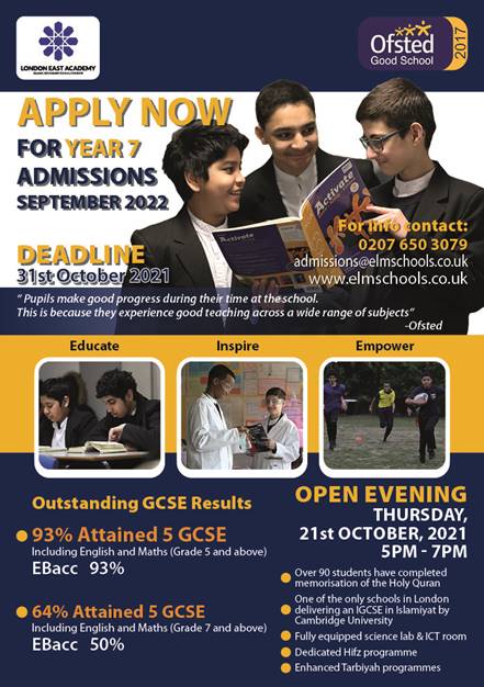 Description : Al- Mizan is an Islamic independent primary school. In 2014 alone, 100% of students got a level 4 or higher for maths and writing in their SATs. Also, 98% achieved level 4 or higher in English along with 96% in reading. The London East Academy is a Muslim-faith independent secondary school which was established in response to the immense community demand for high-quality education that meets the aspirations of modern day British Muslims.