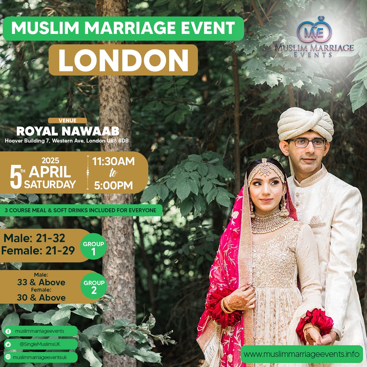 We are holding the next muslim marriage event on Saturday 5th April 2025 at Royal Nawaab, Hoover Building 7, Western Avenue, Perivale, London, UB6 8DB.