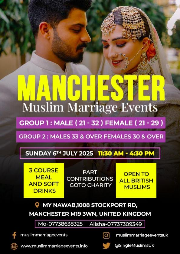 Join us for our upcoming Muslim marriage events on Sunday, 6th July 2025, at My Nawaab, located at 1008 Stockport Road, Manchester, M19 3WN.