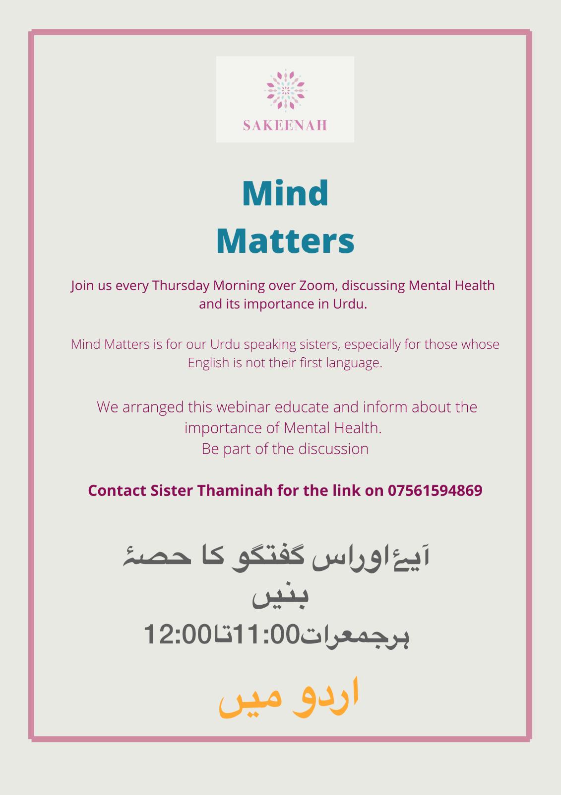 For our sisters who speak Urdu, this Mental health workshop is for you insha'Allah. Form the comfort of your home, be part of the learning and discussion regarding about mental health. Please message the number on the poster for the link to this workshop insha'Allah. Please do care, share and be part of the discussion