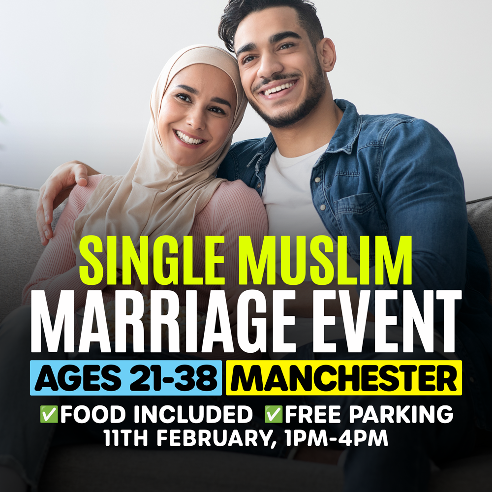 Meet single Muslims in Manchester at our Muslim Marriage Event, on 11th February 2024 at 1PM! for Males aged 23-38 & Females aged 21-36.