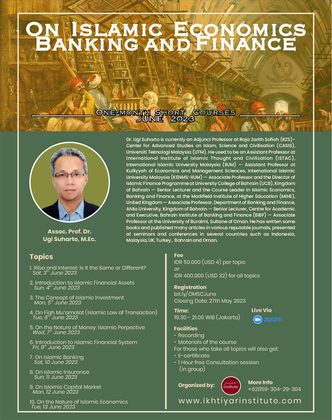 In discourses on Islamic economic, banking, and finance, we still often find confused and wrong concepts that affect our perceptions of money, investment, banking and finance even the laws that underlie our daily relationships with other people (muamalat). In response to this, Ikhtiyar Institute organizes a short course with a total of 15 hours, which aims to provide a basic but fundamental understanding of concepts in Islamic economics, banking, and finance.