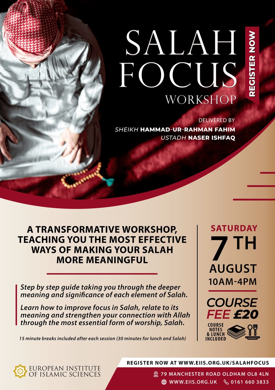 A transformative 5 hour workshop (1 hour of breaks) , teaching you the most effective ways of making your Salah more meaningful.