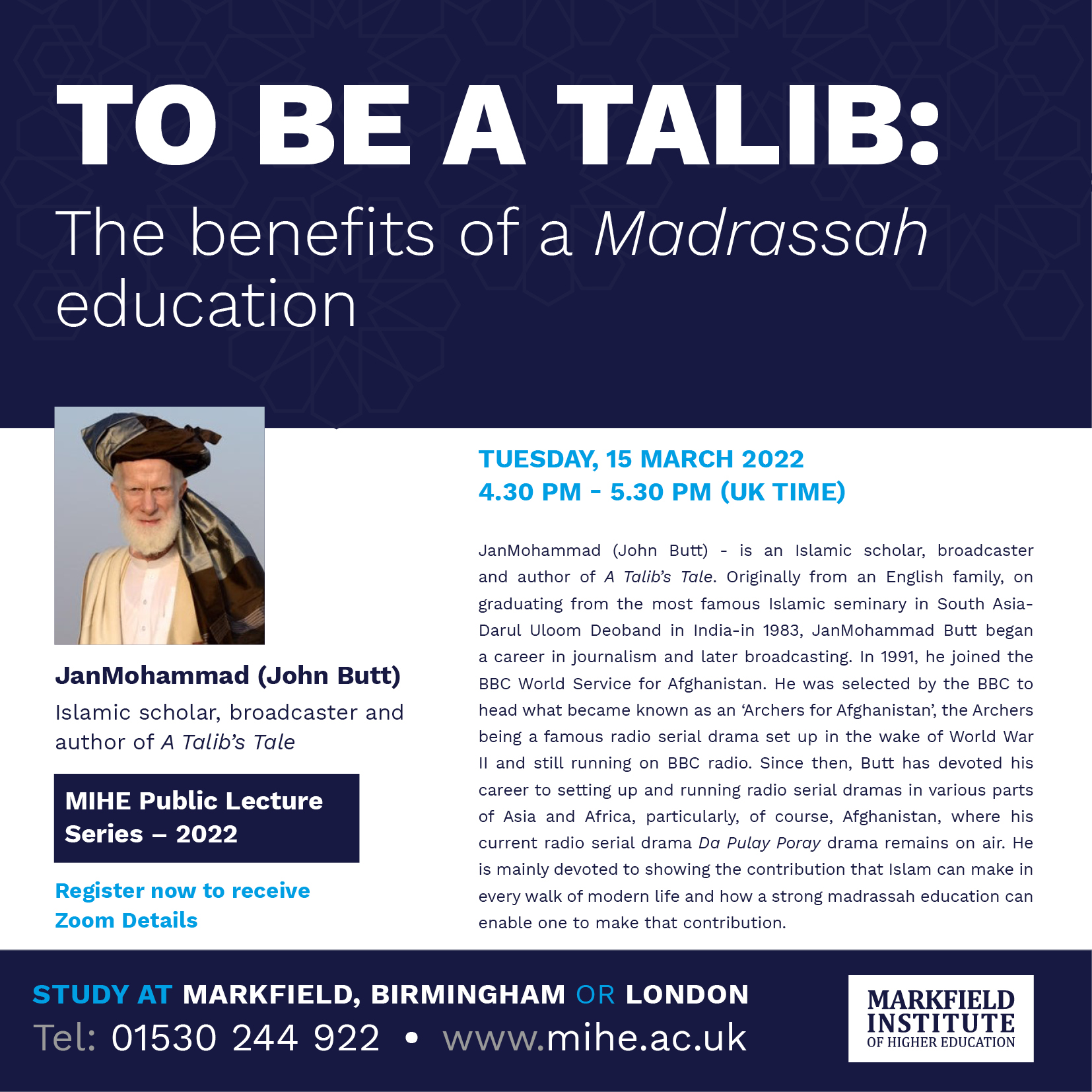 JanMohammad (John Butt) - is an Islamic scholar, broadcaster and author of A Talib’s Tale. Originally from an English family, on graduating from the most famous Islamic seminary in South Asia-Darul Uloom Deoband in India-in 1983, JanMohammad Butt began a career in journalism and later broadcasting. In 1991, he joined the BBC World Service for Afghanistan. He was selected by the BBC to head what became known as an ‘Archers for Afghanistan’, the Archers being a famous radio serial drama set up in the wake of World War II and still running on BBC radio. Since then, Butt has devoted his career to setting up and running radio serial dramas in various parts of Asia and Africa, particularly, of course, Afghanistan, where his current radio serial drama Da Pulay Poray drama remains on air. He is mainly devoted to showing the contribution that Islam can make in every walk of modern life and how a strong madrassah education can enable one to make that contribution.